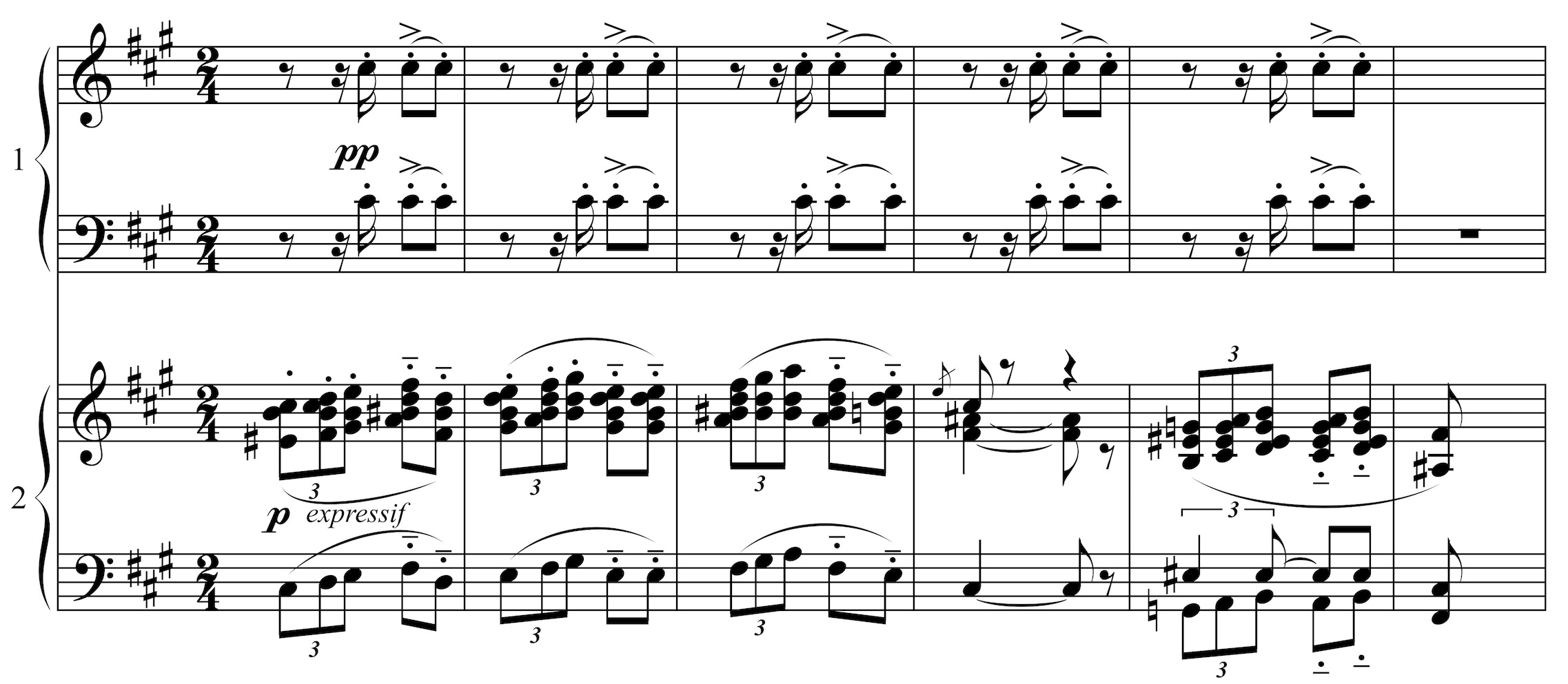 Hauptstreitpunkt ist der Habanera-Rhythmus, der die rhythmische Basis beider Stücke bildet. Nun hat der Habanera-Rhythmus als solcher seinen Ursprung in der spanischen Musik und die pure Verwendung desselben kann keinem Komponisten als Plagiat vorgeworfen werden. Deshalb geht es um die Frage, wie diese kurze rhythmische Figur verwendet wird. Und genau da gibt es erstaunliche Parallelen zwischen beiden Werken. Debussy schreibt die Figur über weite Teile von "Soirée dans Grenade" auf nur einem einzigen Ton, meist dem cis3. Tritt der Habanera-Rhythmus alleine auf, wird meist ein weiterer Ton als Begleitung hinzugenommen, wie zu Beginn und auch am Ende das cis4 (Notenbeispiel 1). Dies stellt eine ziemlich ungewöhnliche Verwendung dieses Grundrhythmus dar.